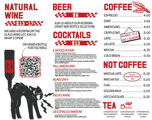 We serve a full cafe menu just like all of our other locations, but in the evening this space transforms into a full bar serving natural wine, cocktails, and beers galore.