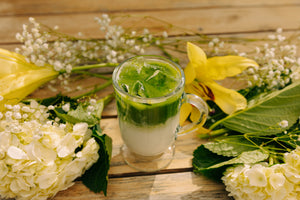 Matcha, orange vanilla syrup, a splash of half and half (or oat milk), topped with soda water- available iced
